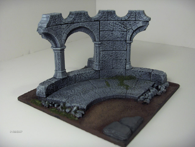 It usually doesn’t take me long to finish a paint job on a small piece of terrain, not the least of reasons that I tend to be sloppy and rush it. I did run into a few problems with this one, though. For one thing, my usual can of light gray paint totally dried up, so I ended up using some craft paint that was a lighter gray, making for a more severe color contrast. I’m also not keen on how the mossy parts ended up, but I need to really consider using flock instead of foam greenery.