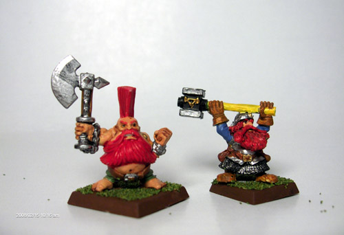 In addition, I am sort of debuting two dwarf heroes, a runesmith and a dragonslayer. These guys were actually painted a while back, like in the dawn of my miniatures painting. But I had never finished them, so I decided to get in a couple of “cheap wins” by polishing these guys off. Note the yellow handle on the hammer–the influence of “how to paint miniatures the Games Workshop way” of the 1990’s.