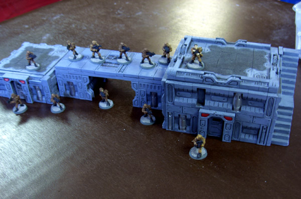 I’ve had a hankering for science-fiction. I don’t know what game I’d play, but I thought I’d bang out a quick high-tech catwalk that could be used to bridge both of my older sci-fi buildings together. I think it turned out well, enough so that I may try to do a whole set of cat-walks for a Necromunda-style table.