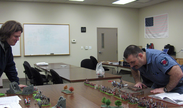 In the second round of the 2009 Warhammer Campaign I once again found my Vampire Counts, led by Manfred “Voldemort” Von Carstein facing Vince’s “OSU Buckeye” Bretonnians, backed up by the Green (“Scarlet and Gray”) Knight.
