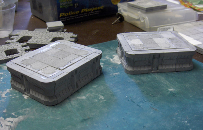 You’ll also need four 1″ bricks. Take the wall pieces of 301 for the outside, and the floor tiles and odd wall piece for the inside. The corner pieces from 303 obviously go on the corners. Use the #270 tiles for the top. You’ll need to mount those pieces on something that is 1/4″ thick. I use foamcore, which isn’t frugal, but you can use foamcore (although a lot of that stuff is 3/16″ thick now, so you may need to add a layer or two of heavy card.