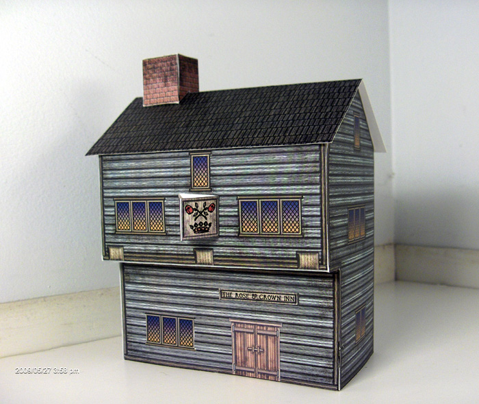 My second building from Vyllage-in-the-Cheep, the Rose and Crown Inn. I’ve noticed, in comparison to WWG, that the Microtactix stuff is, well, cheaper, not just in price in but in some details. The soffits (the edges on the underside of the roofs) are not detailed, for example. On the upside, there seems to be more character to the pieces. In Villageworks, the pieces are fairly uniform in order to allow some interchangeability. That is sacrificed in the name of making each building unique and flavorful in Microtactix.