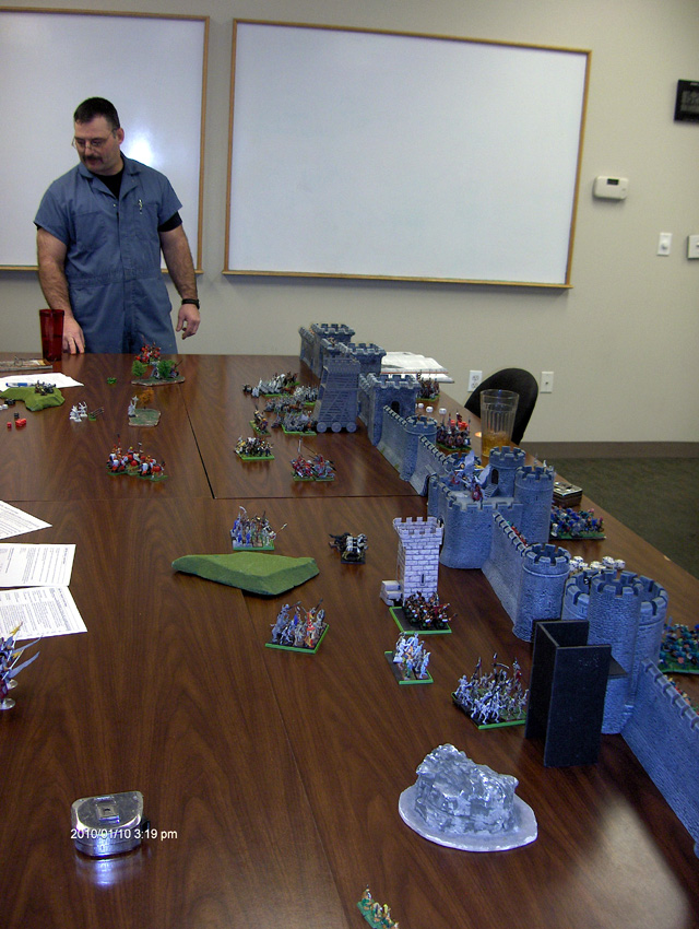 On the Skaven side things went very badly. The Green Knight and several knight units went outside the walls and killed Thanquol and scattered many of the units. There were also a lot of misfire problems with the Skaven weaponry. By the time the Skaven got through the walls, the knights made easy work of them.