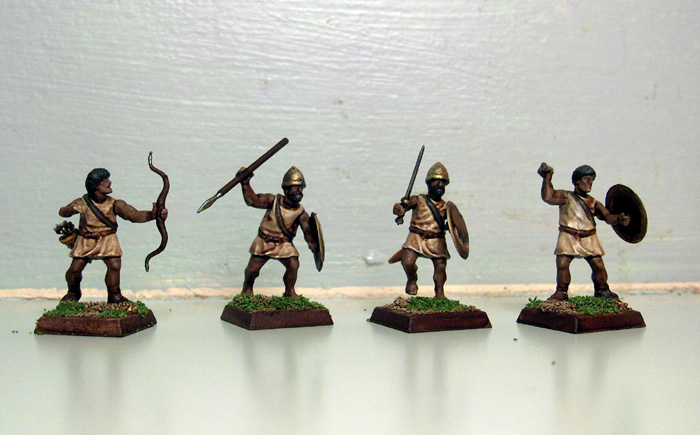 Initially I had thought of trying to have the javelin-wielding figures just hold the javelins as spears, pointing upward. Unfortunately the arms just don’t look that good in that position, so most of my “spearmen” are going to be holding them over their heads.
