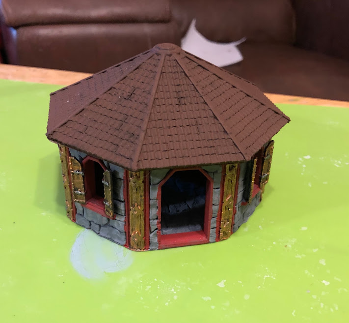 I finished the paint job on the dwarf house from Printable Scenery. While I have a slight feeling that it looks like a Chinese restaurant, I do like the end result and think it is a attractive, not-too-overwhelming piece for a wargaming table.