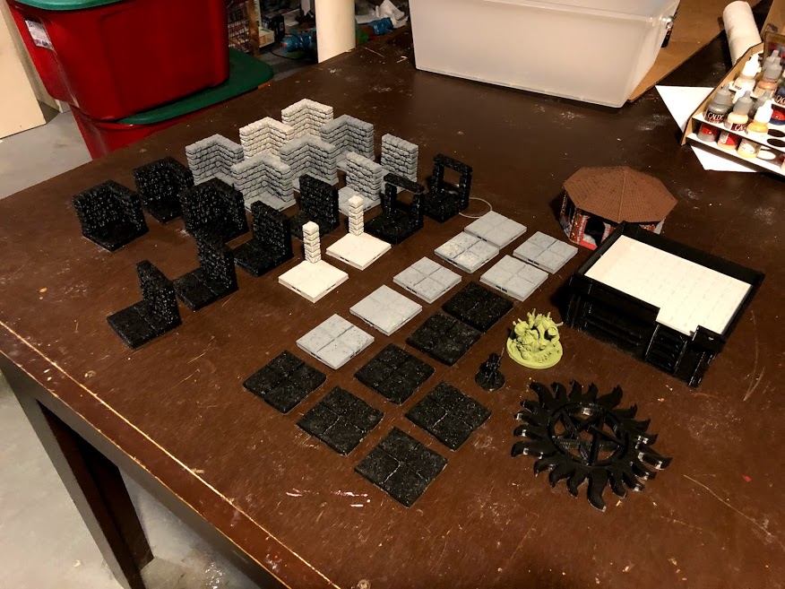 My plan is a little off. Based on the photo, have 12 floor tiles, 11 corner tiles (there were two that were at the time of the photo being printed), and only 6 wall tiles. Two of the door frames are done, but not the doors, and two of the corner column pieces are done. I’ve also created a sci-fi building, a dwarf building I have shared here before, a coaster of the anti-possession tattoo from “Supernatural,” and a few other odds and ends.
