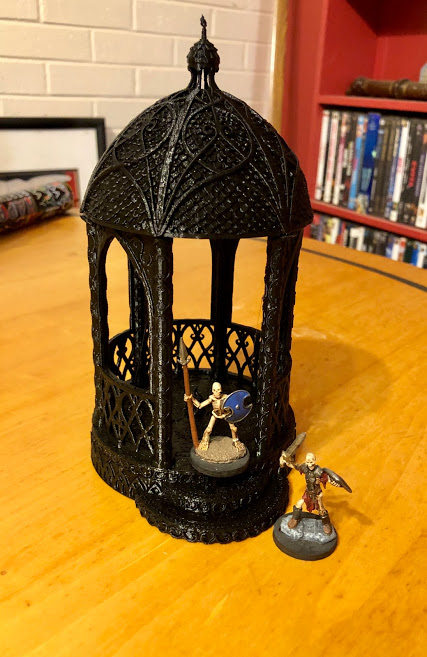 This is the “Shrine of Solace” from the Elven section, and is printed in two pieces: the lower part and the roof. I can’t help but think of the classic D&D joke/story with the punchline “A gazebo? I draw my sword!”