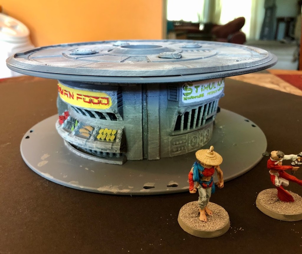 The design for this cyberpunk shop was by Digital Taxidermy as part of their Kickstarter where used filament spools could be used as the core of terrain. The printed parts are simple shells attached to them, so very little filament ends up being used. Obviously there’s an opportunity to stack the pieces on top of each other, print walkways, etc.