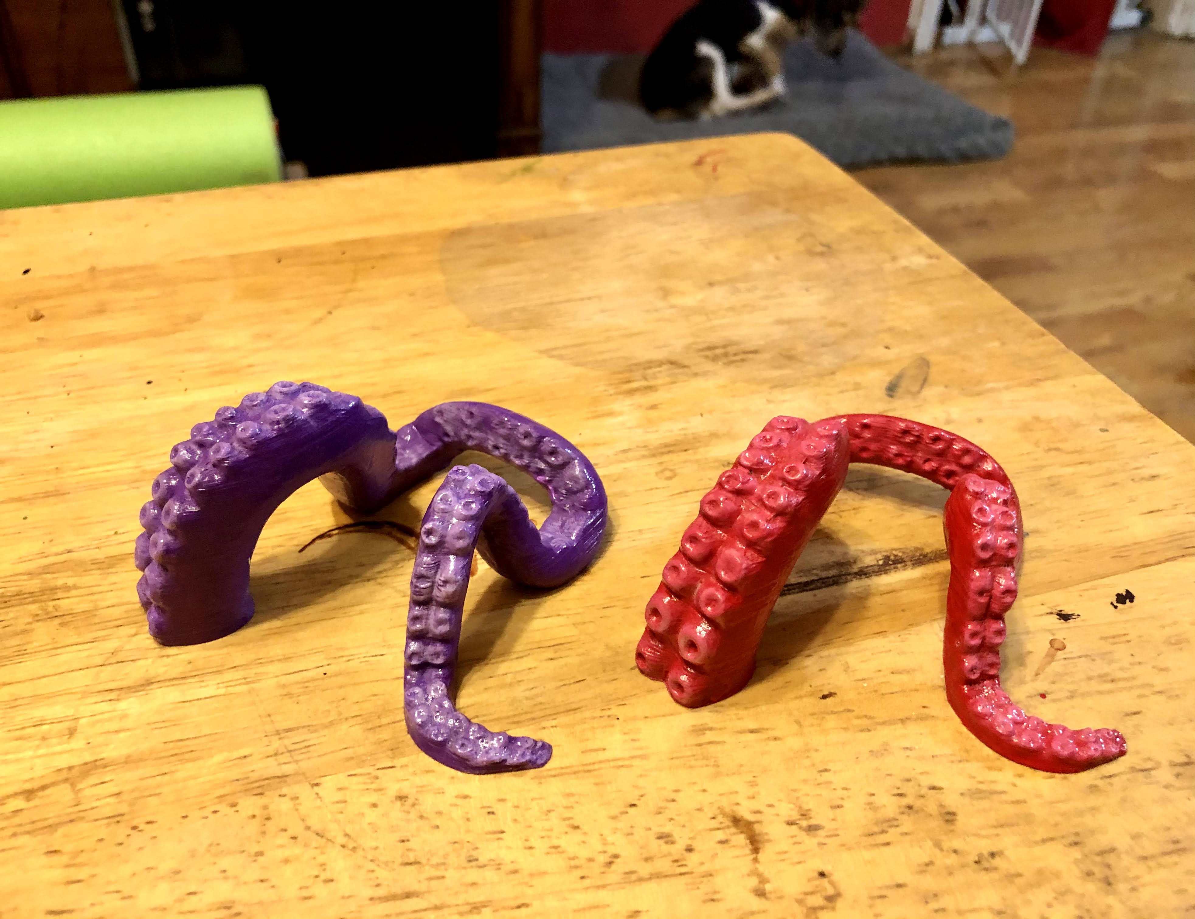 So the popularity of the first tentacle phone holder has led to my making no less than five move of these guys in different colors: purple, light green, light pink, crimson, and orange.