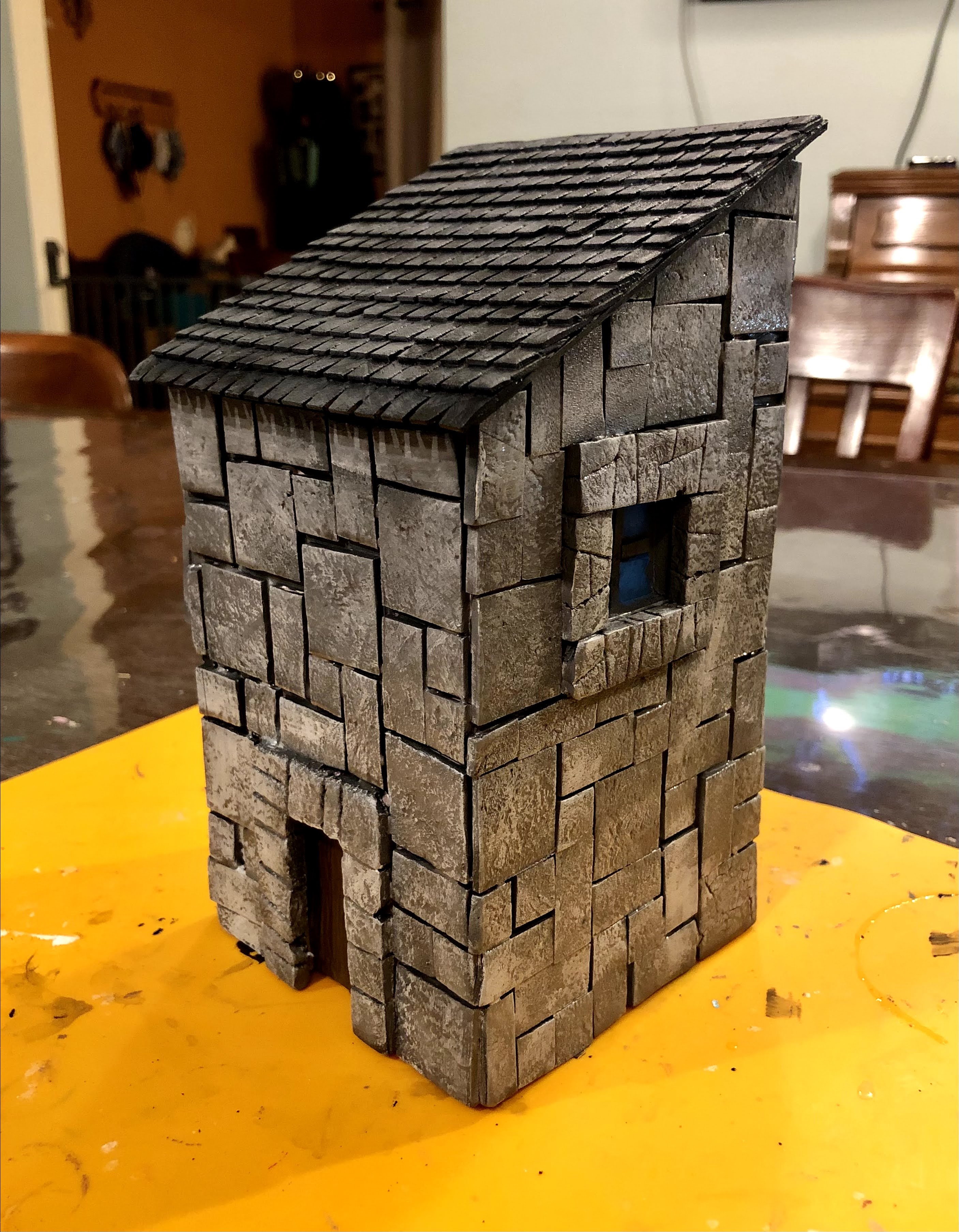 In hindsight, it might be better with more windows. It looks like a jail or a stockade or a garrison of some kind, which isn’t a bad thing. I’m not 100% sure I like the effect–for my next stone building I am going to carve the foam instead.