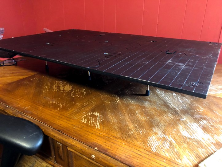 Now if there is a downside, it is that the table that I bought is only 2′ by 3′ (to be fair, you can buy extra pieces). However, given that I play on a 4′ by 8′ table, that gives me a 12-18 inch margin around the outside, which is comfortable.