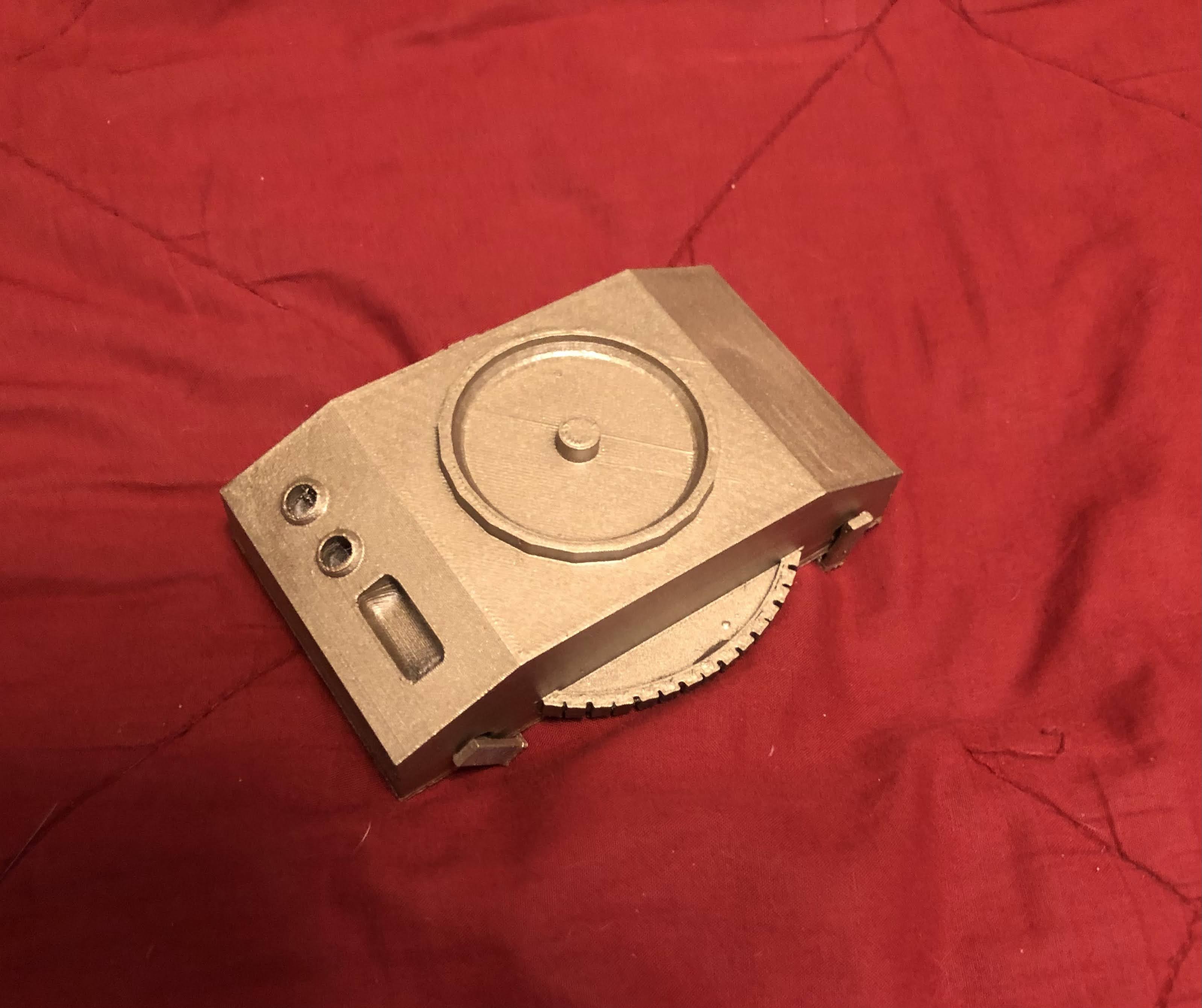 In the Dune series by Frank Herbert, the Holzmann Shield generators were a literary device that scuttled the traditional sci-fi weaponry of projectile guns and laser beams and forced the use of hand-held melee weapons to reinforce the feudal motif of the series, since only a slow-moving blade could penetrate a Shield, and lasers would trigger catastrophic chain reactions. In the 1984 movie Dune, the shields were depicted as being generated by golden belt devices like the one above. The picture is over a replica shield generator I printed and gave to my daughter Macy, who is dressing up as a House Atreides soldier for Halloween this year, continuing her tradition of coming up with completely incomprehensible homemade costumes that speak to her own nerdy interests.