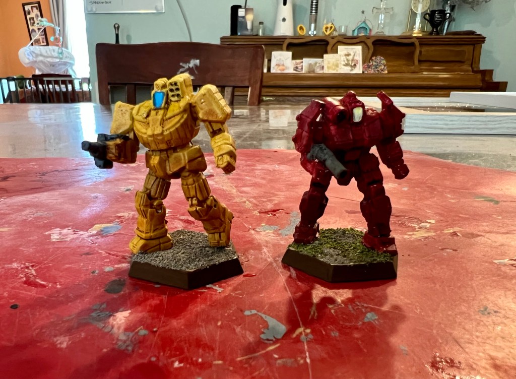 Not fantasy creatures or superheroes but Battletech mechs. This isn’t a new project; a friend of mine is getting into Battletech and has invited me to play. I had these two from the starter set, so a quick paint job was in order.