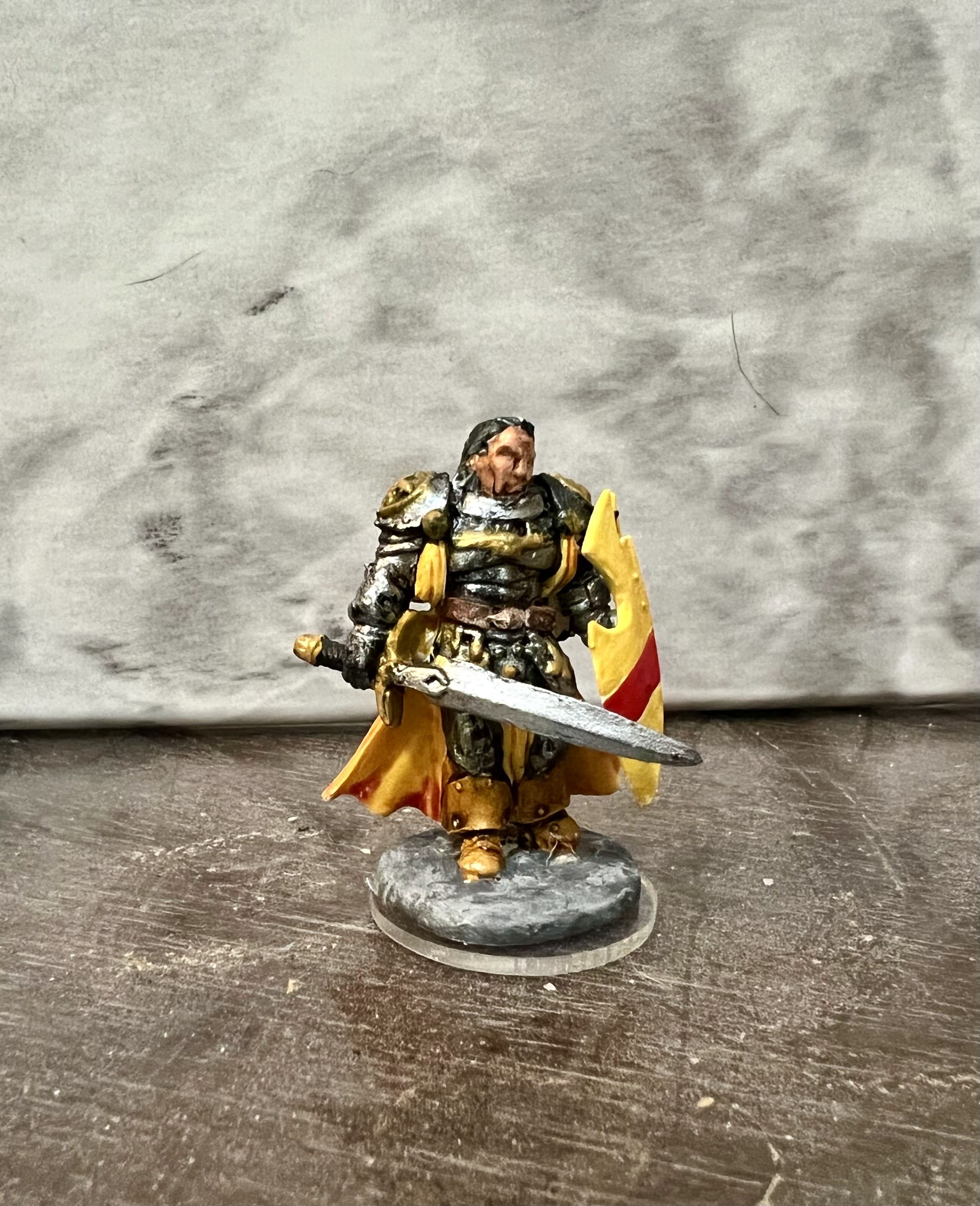 Oh, it is so, so frustrating when I spent hours painting a miniature for one of the player characters only to have that player duck out on the game that night at the last minute. Well, this is the paladin of the party, Shephard. He’s “Duke Gerard” from the Reaper Bones miniatures line, which I picked up in a Kickstarter ages ago.