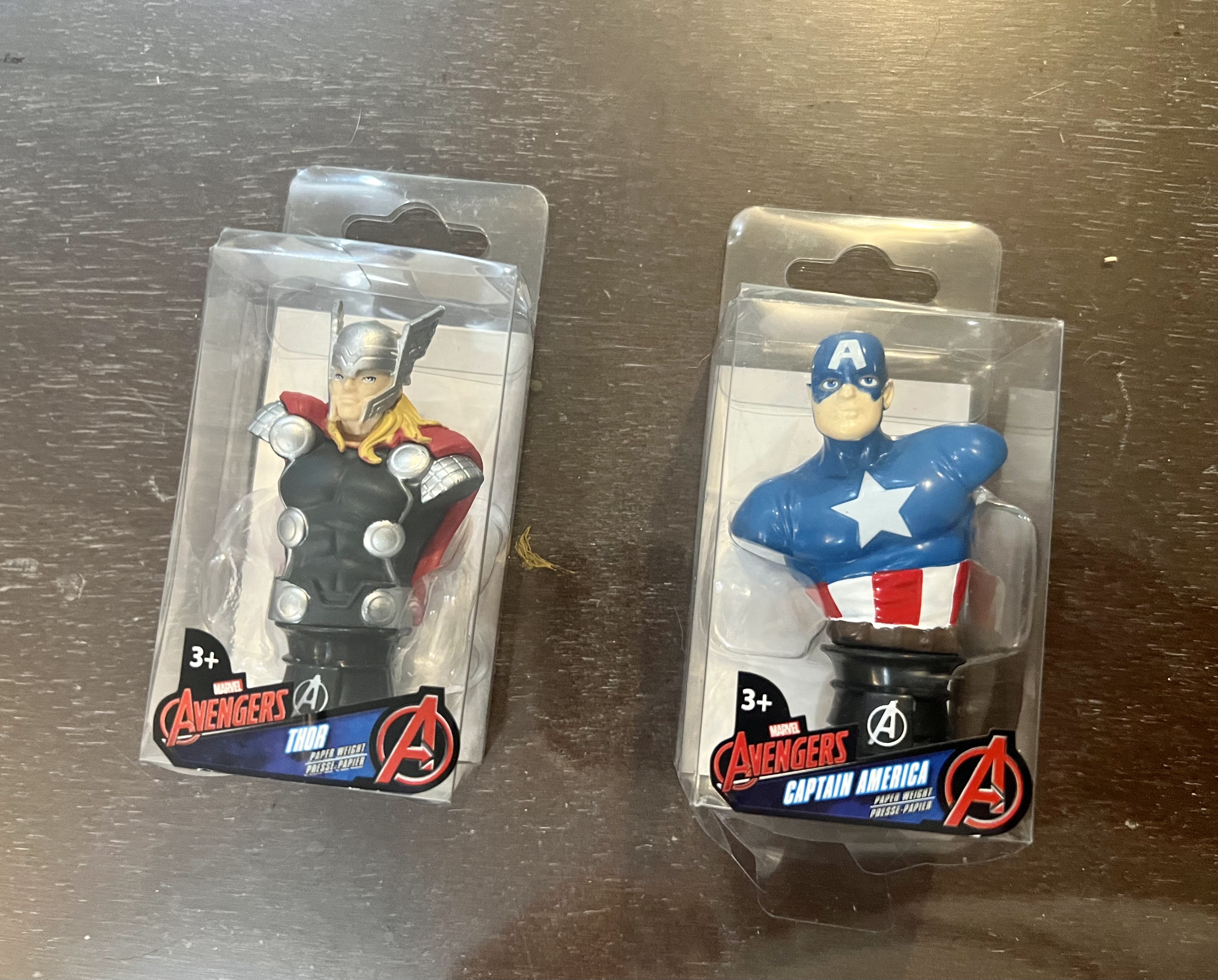 So there is one wooden hexagonal tray and Handy Shammy that I will think about converting into a dice tray, a cleaning towel and paint scraping that will go right to work with my 3D printer, a wood rectangular panel thing that I’m not sure how I will use but I think something will come to me, and two…figurines? They are little busts of MCU Avengers characters, which I’ve seen converted into statuary elsewhere, and will do the same here.