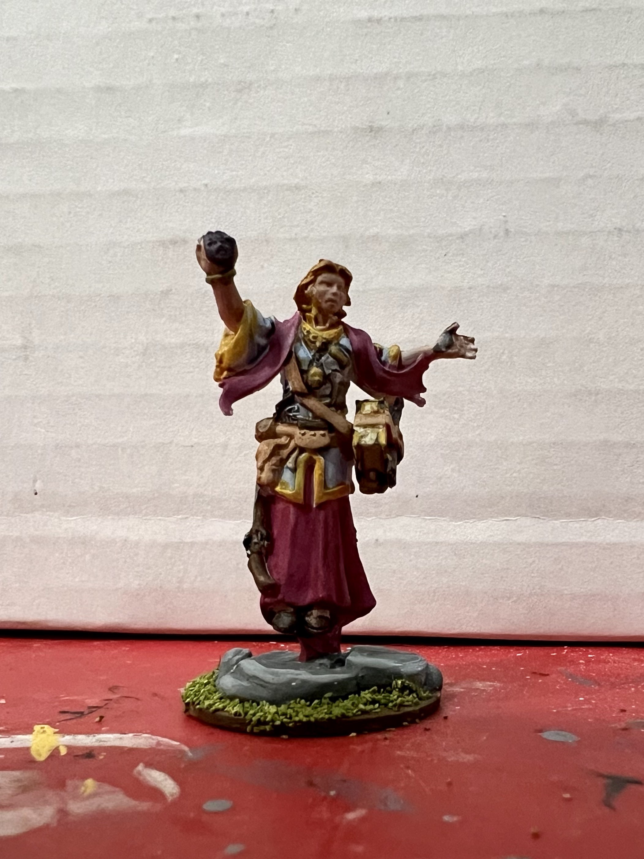 What’s not to love about a fantasy miniature featuring someone who is floating, carrying an magic rock of some kind, and has a flintlock rifle? There’s even a magical tome and two short spears. The figure is a “mystic theurge” which is a Pathfinder prestige class that I believe is a cross-class cleric and wizard, but don’t hold me to that.