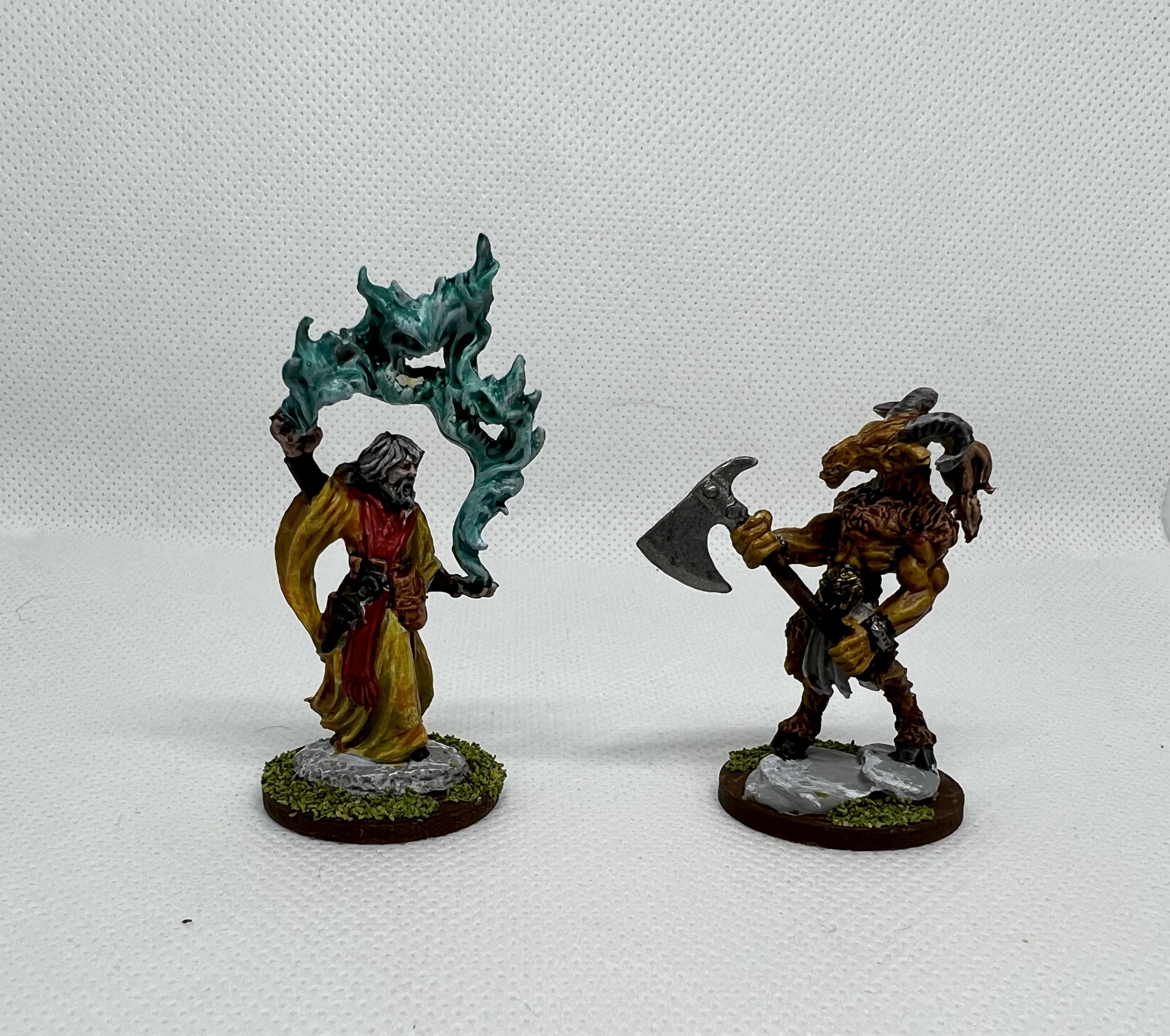 The second is “Aaron, Conjurer Wizard” by Reaper Bones (another pickup from their Kickstarter). The yellow paint over the zenithal primer layers muted the tomes down a lot, and in hindsight I might have just left it white or done more highlighting. I love the monstrous faces in the spell effect, and tis guy would make a good PC mini in a pinch.