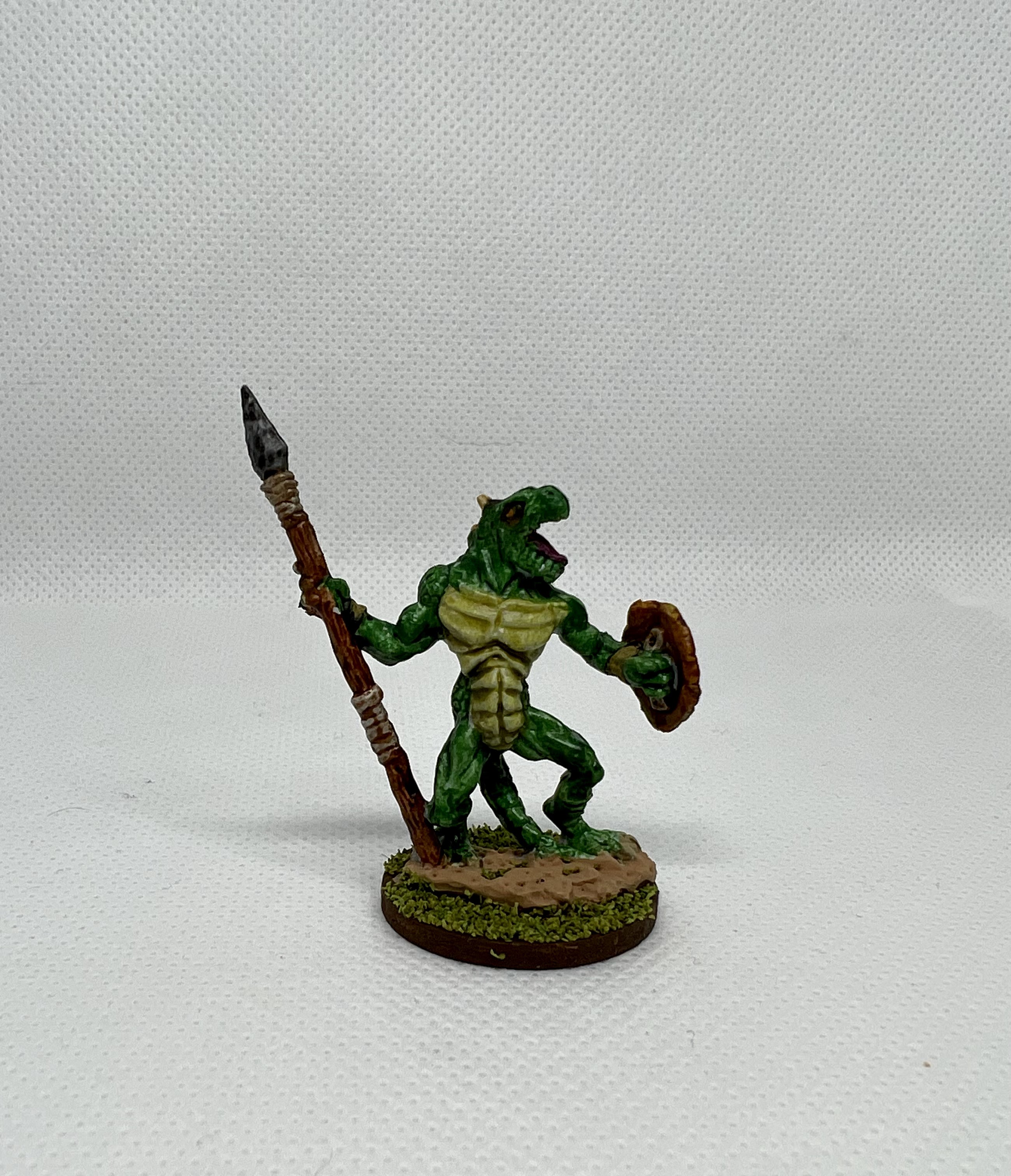 This cold-blooded fellow is “Lizardman Warrior,” another Bones figure from Reaper Miniatures. He is a pretty simple, straightforward figure with the kind of detail that works well with contrast paints.
