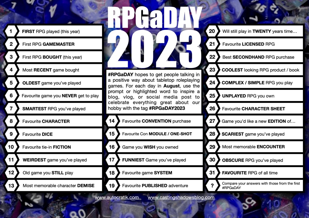 “First RPG Gamemaster” (I am assuming “this year” and not “ever”) has the same answer then, so I’ll pick this up on day 3.