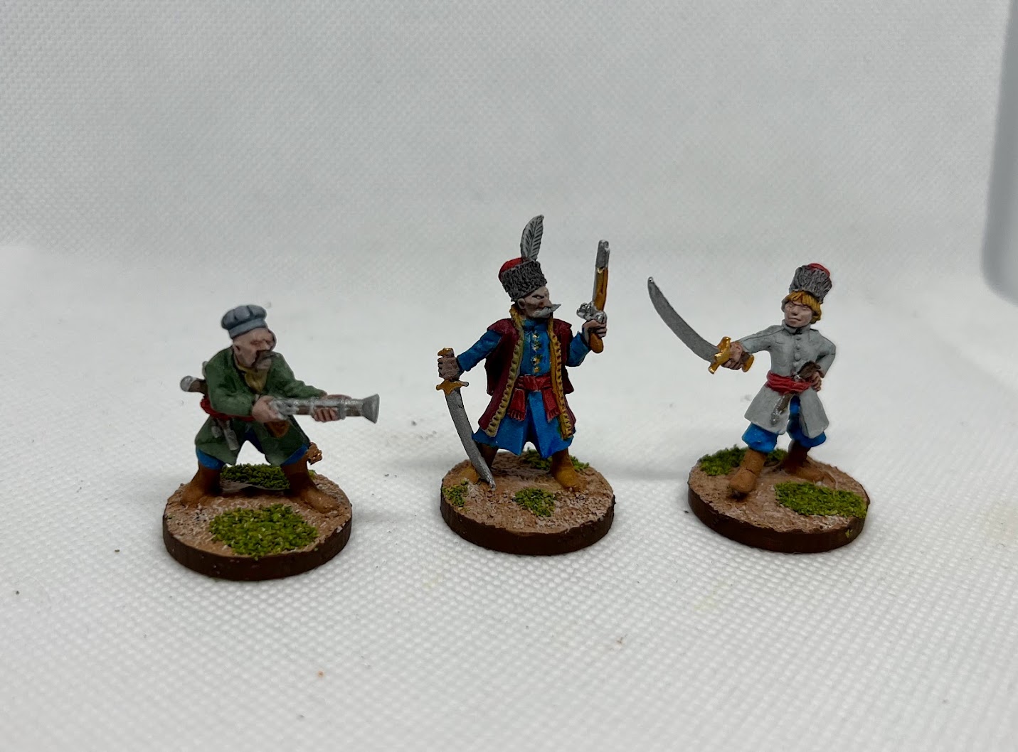 I’m back to painting up odd miniatures from my collection, in this case more Cossacks. I had painted some earlier, when I first started using Army Builder Speedpaints and were learning the ropes with them. Now, I’m quite a bit better at managing them, and have painted up four more: a man with a musket, a leader, and a youth, all from Wargames Foundry.