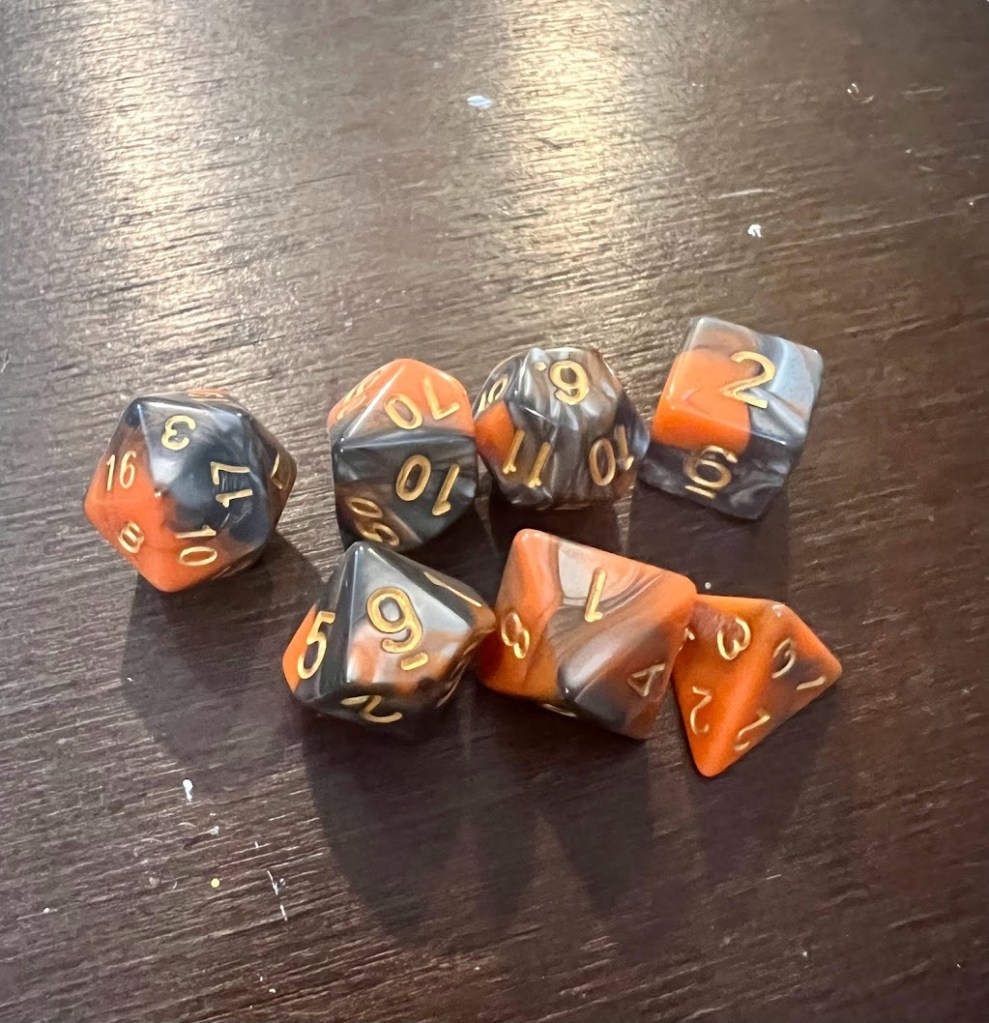My favorite dice set is an orange and gray one, mostly because that was the team color of one of the first roller derby teams with which I skated.