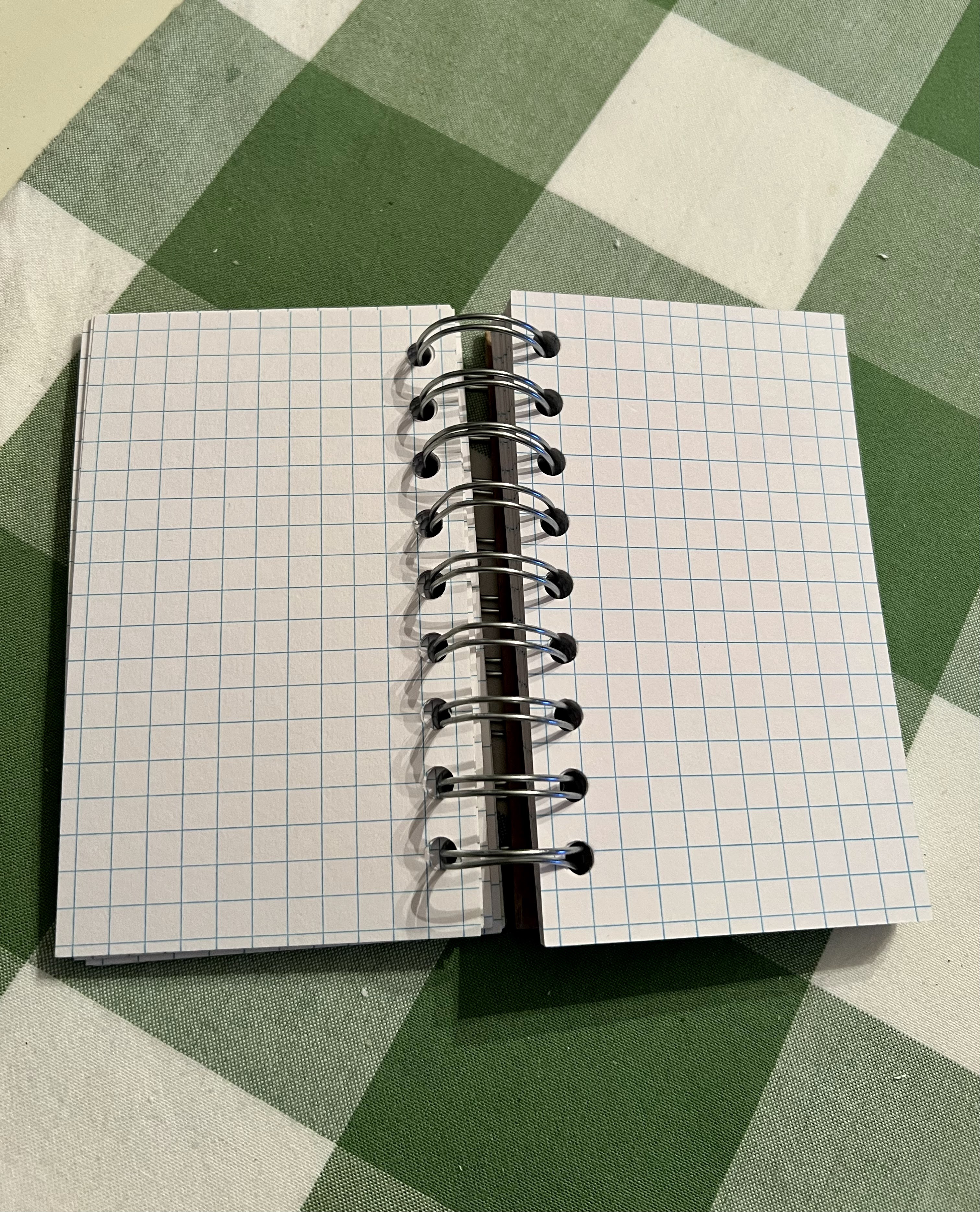 I’m using a hole punch and coil press device, along with thick cardstock for the cover. In this case, the pages are made simply from a pack of graph-paper index cards. I figure that I can do one or two rooms a page and still have plenty of room for a brief description on the opposing page.