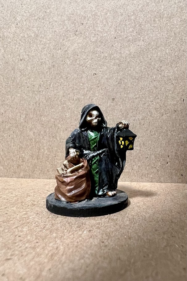 For me, though, he looks like an undead halfling who serves some higher power collecting bones from cemeteries or perhaps his master’s dungeon to be used in the creation of new undead. In addition to just being a free-standing threat, he could also be a source of information about the BBEG he serves, if the players handle their business right….