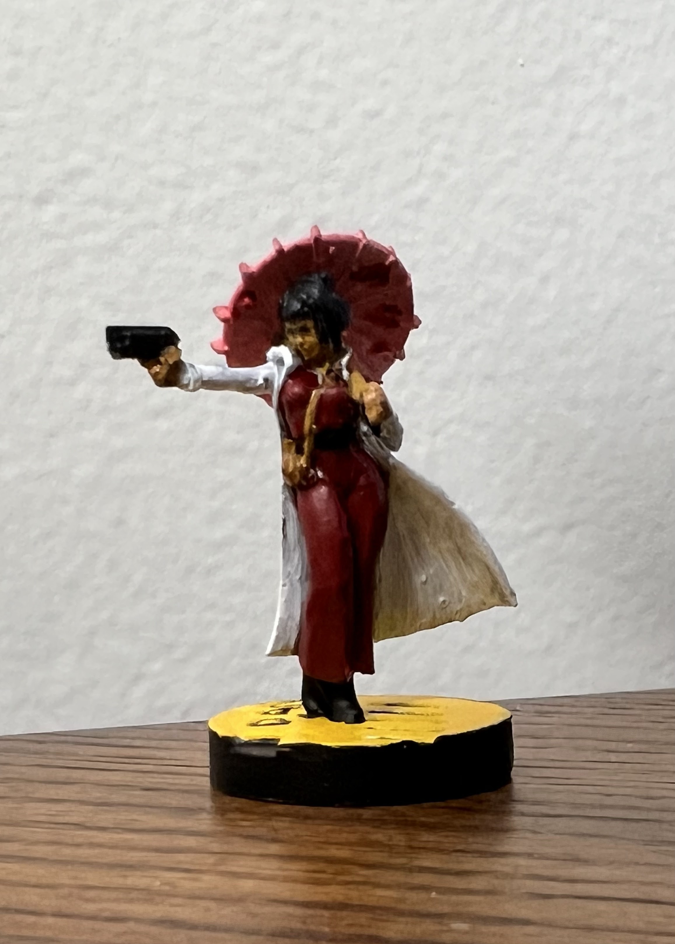 But she’s a cool figure, and I really like the freehand work I did on the parasol. She would make a fine NPC for a cyberpunk game, or even a PC for the right kind of character.