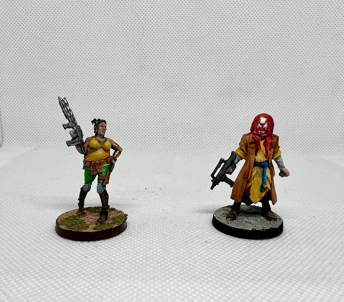 These two miniatures are from the Zombicide: Invader game, which is their sci-fi iteration of the board game (swapping in aliens for zombies). On the left is “Mercedes Madrid,” an engineer on the space station depicted in the game. On the right is “Takuetsu,” one of the special promotional kabuki gang members. He ended up looking a little bit like Ronald McDonald, which is kind of a coincidence.