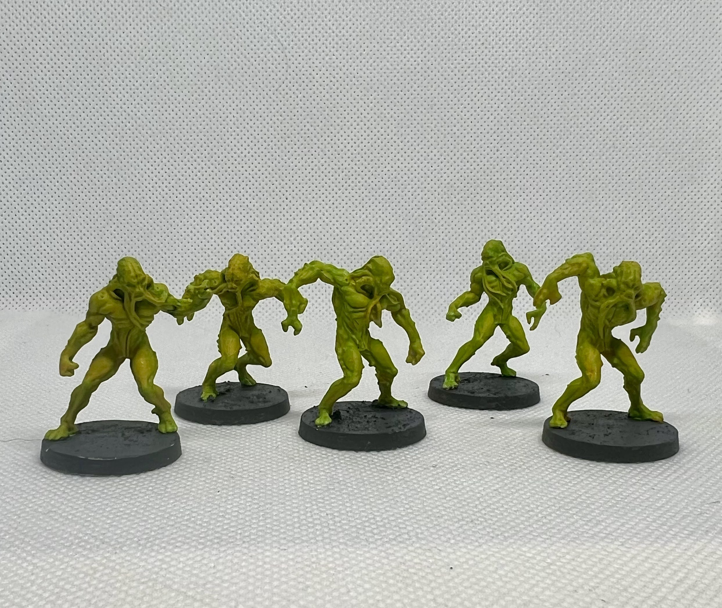 These are aliens from the futuristic board game Zombicide: Invader. The first pick are Xenos Workers and I really wanted to try some kind of natural, oceanic color scheme and while you can not tell they were painted with multiple blending layers from green to yellow with subtle colored ink shading and in the end they just look green. Worse, flat and green. I have wondered if they might benefit from a dark wash to draw out the details. I suppose they could also do double duty and vegetation-themed aliens like the comic book character Swamp Thing (who I know is not an alien, but you understand what I am trying to say here).
