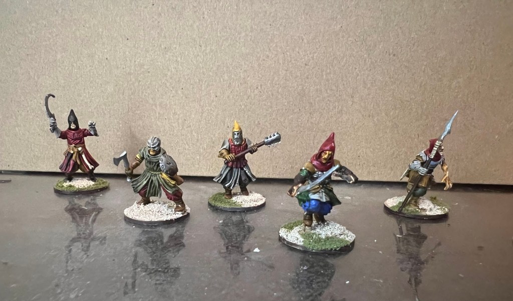 After a bit of a haitus (including a week at sea) I am back to painting miniatures, having finished another sprue of cultists from Oathmark miniatures from Osprey Games. Like the first batch, they are painted to be part of the cult of Bhaal in my D&D campaign.