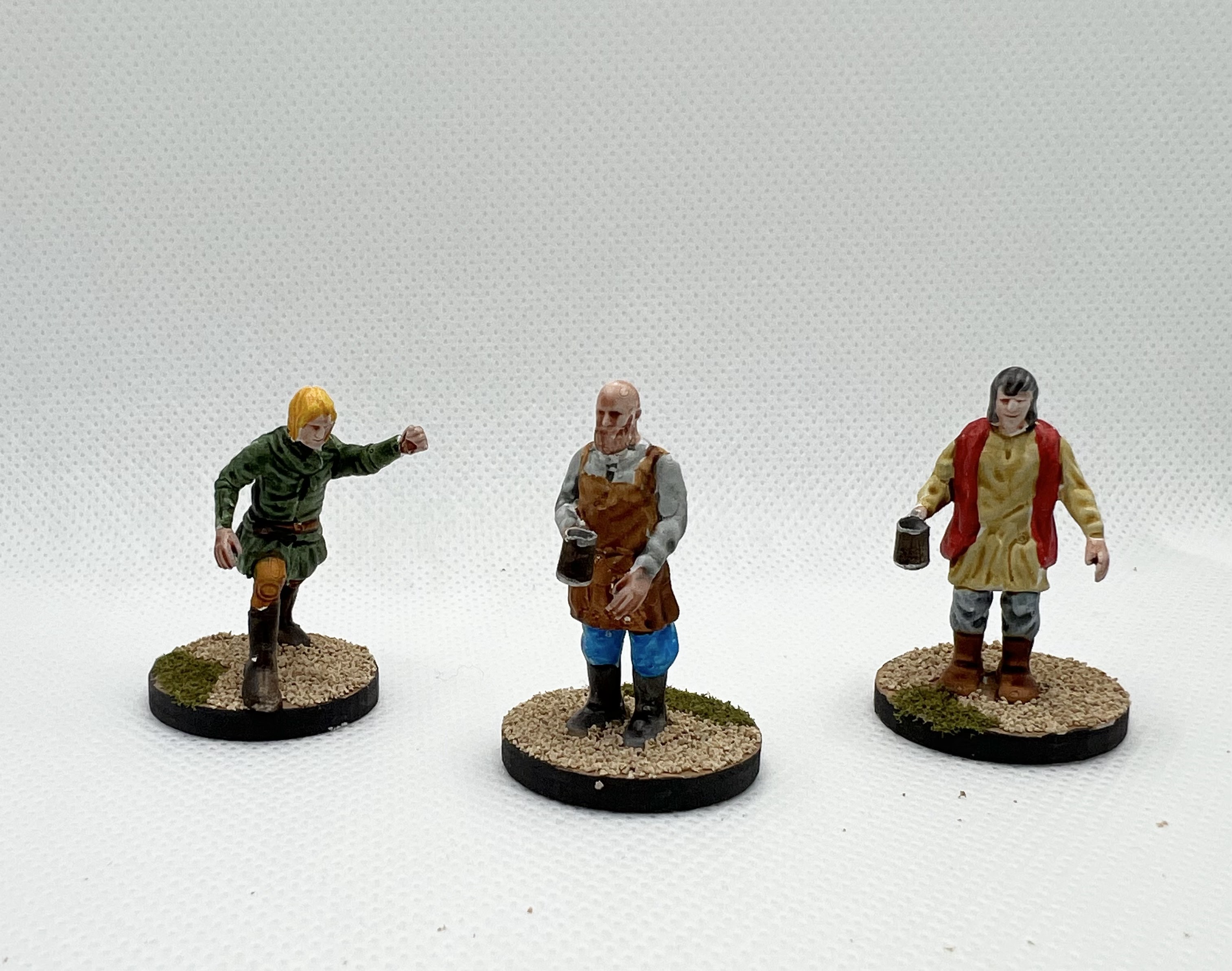 I was thinking recently it would be good to have some generic peasants to serve as background extras for various scenes in my D&D campaign or Warrior Heroes of Talomir as NPC Grunts, so I dug through my extensive library of stl’s and discovered a cache of peasants from Philip Sin’s Miniatures. They are far from fancy and lack a lot of detail, but for what I was looking for they do just fine. I didn’t go all out on the paint job–just a simple speedpaint cover, my typical base covering these days, and they are good to go. I will say that their feet are a bit oversized, but given that you have to glue them to the base (and the problems I have had with more “accurate” sculpts) this might be a feature rather than a bug.